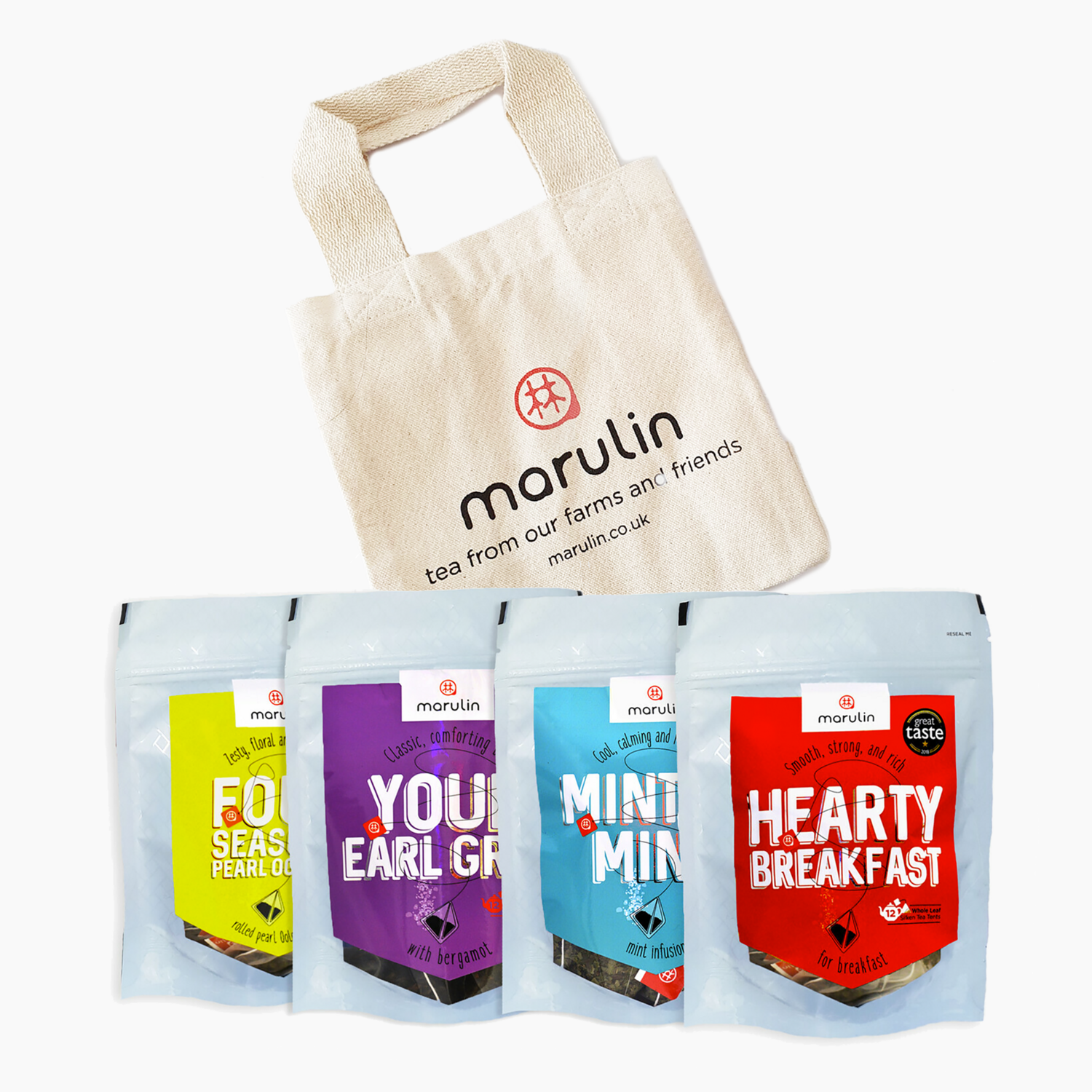 In this hamper, you will receive a treat-filled magical Marulin reusable, heavyweight tote. In addition to the tote, you will receive 4 x pouches of your favourite Marulin tea tents. Please select them from the drop-down menus.